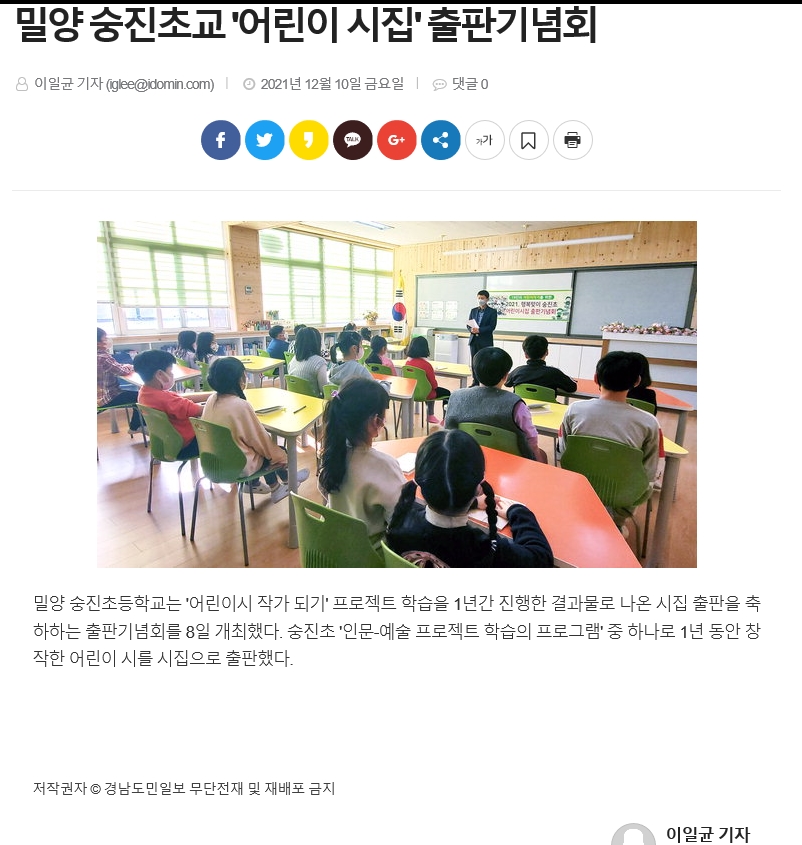 밀양숭진초교 '어린이 시집' 출판기념회(경남도민일보, 1210) 언론보도 자료입니다.
