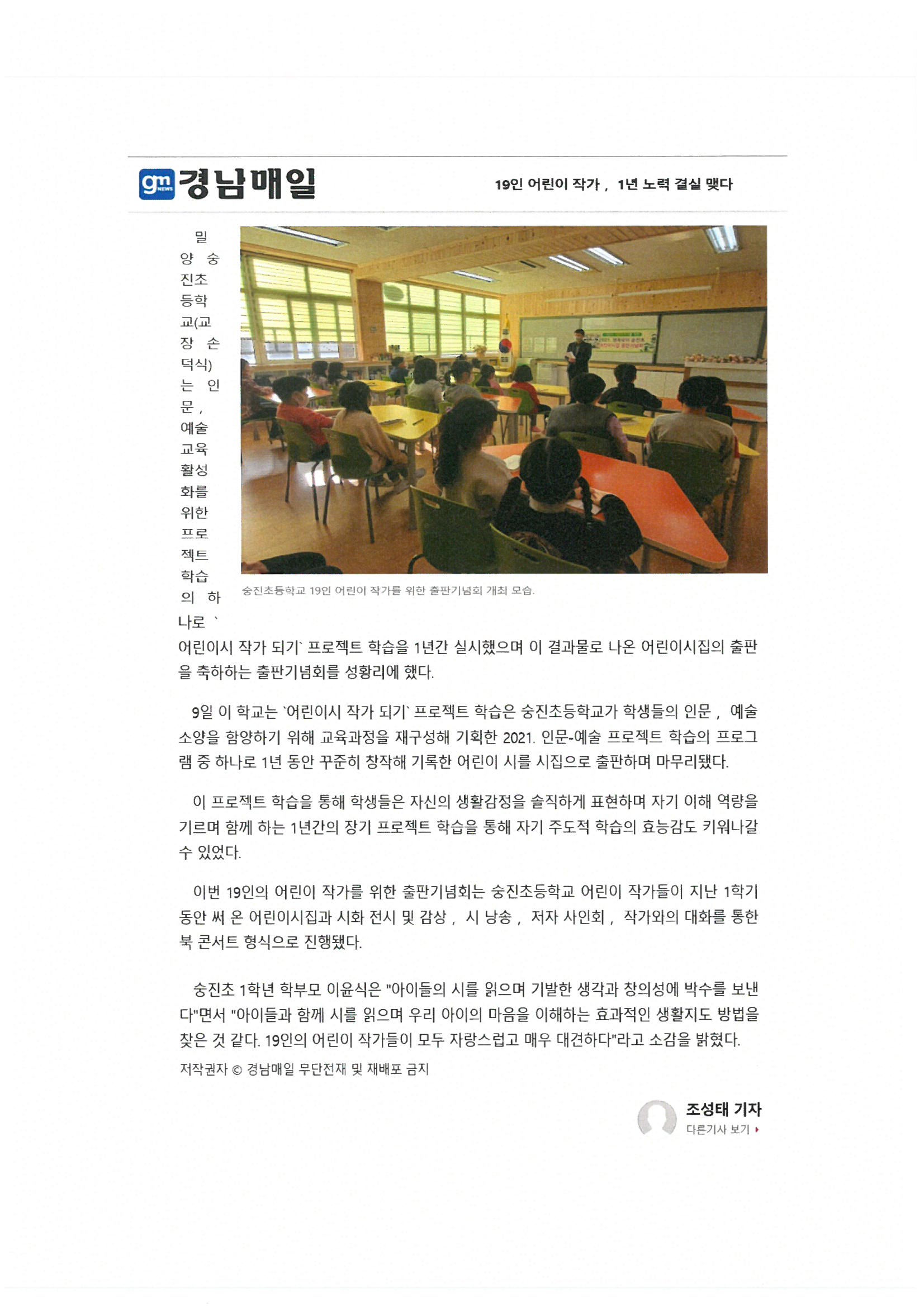 어린이시작가되기 출판기념회 개최(밀양시민신문, 12.17) 언론보도 자료입니다.