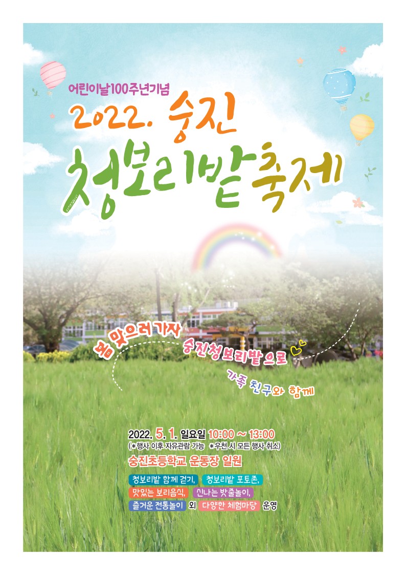 제100주년 어린이날을 기념하여 작은학교 살리기 교육활동으로 <2022. 숭진교육가족과 함께하는 청보리밭 축제>를 아래와 같이 운영하오니, 바쁘신 가운데 참석하시어 자리를 빛내 주시고, 코로나로 지친 시민들이 참여하여 마음껏 기뻐하고, 즐거운 시간을 보낼 수 있도록 적극 홍보하여 주시기 바랍니다.