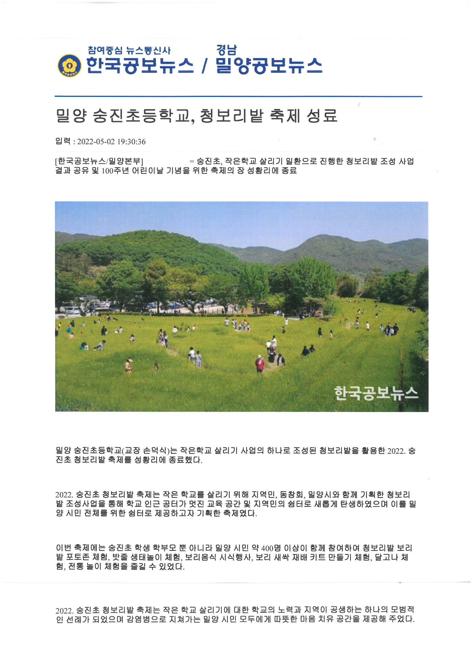 2022. 밀양 숭진초등학교 청보리밭 축제 성료(경남밀양공보뉴스, 05.02.) 언론보도