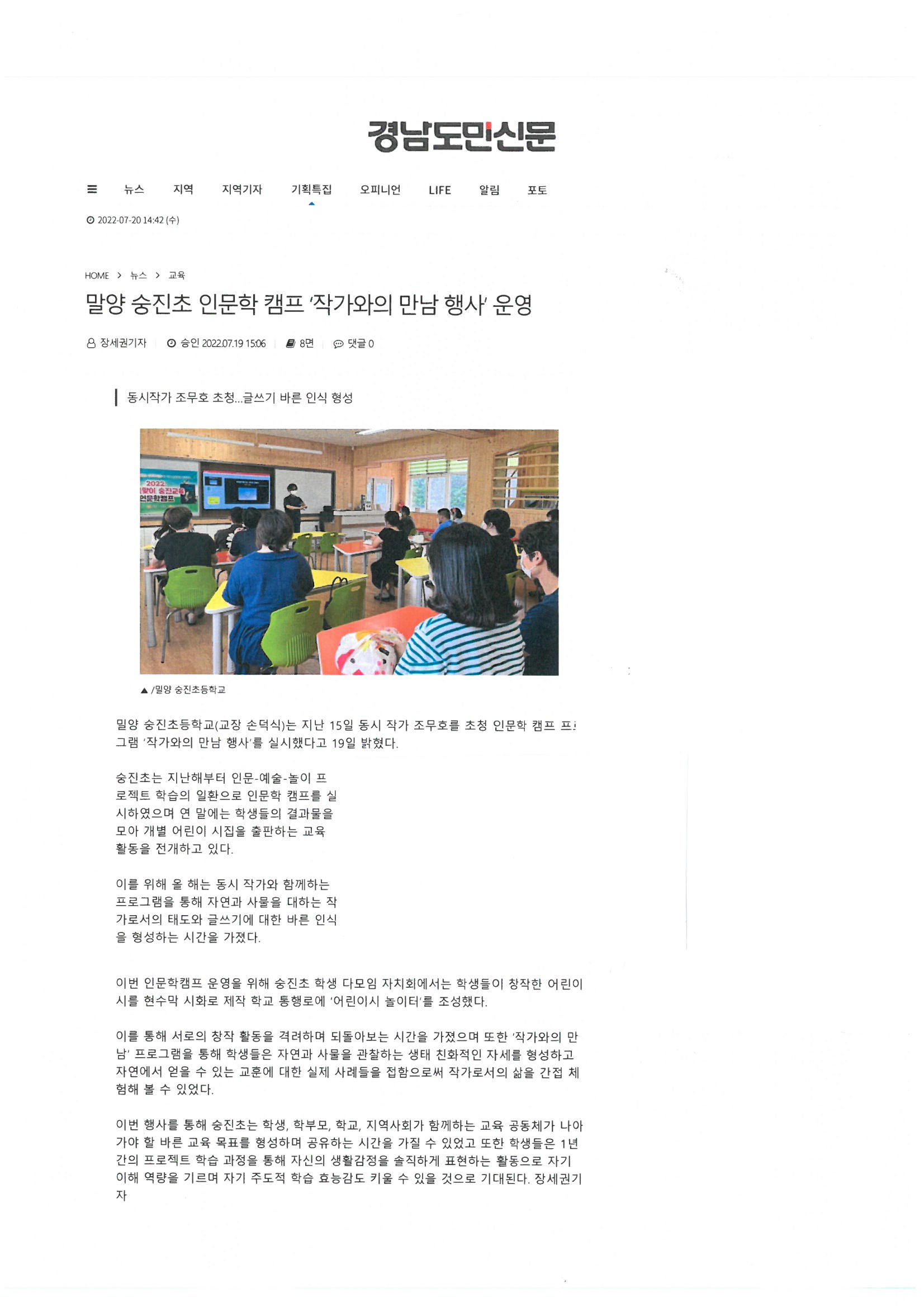 2022.밀양 숭진초 인문학 캠프 '작가와의 만남 행사' 운영 (경남도민일보, 07.20.언론보도) 자료입니다.