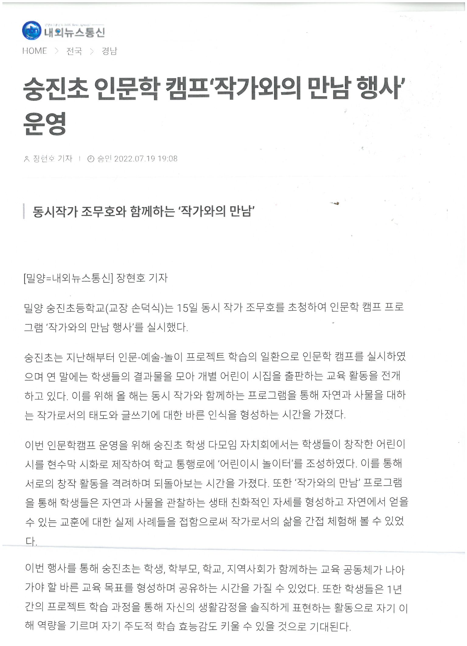 밀양 숭진초 인문학 캠프 '작가와의 만남 행사' 운영( 내외뉴스통신, 07.19. 언론보도) 입니다.