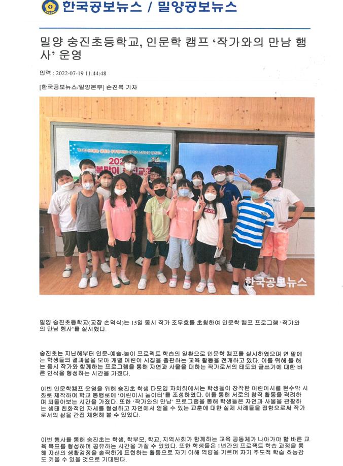 밀양 숭진초 인문학 캠프 '작가와의 만남 행사' 운영( 한국공보뉴스/경남밀양공보뉴스, 07.19. 언론보도)