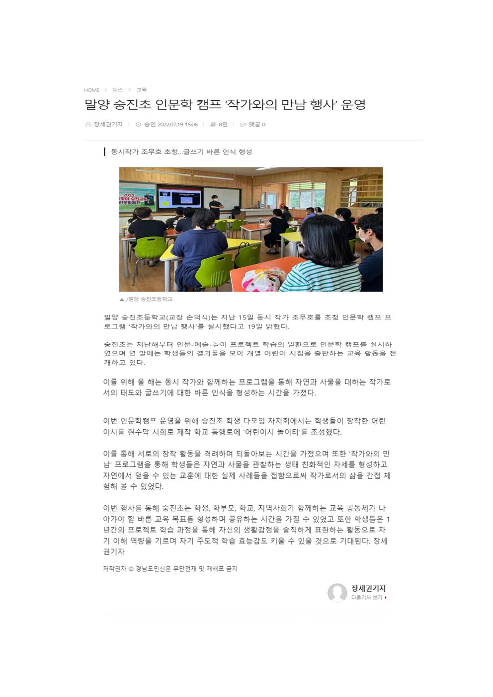 밀양 숭진초 인문학 캠프 '작가와의 만남 행사' 운영(경남도민신문, 07.19. 언론보도)