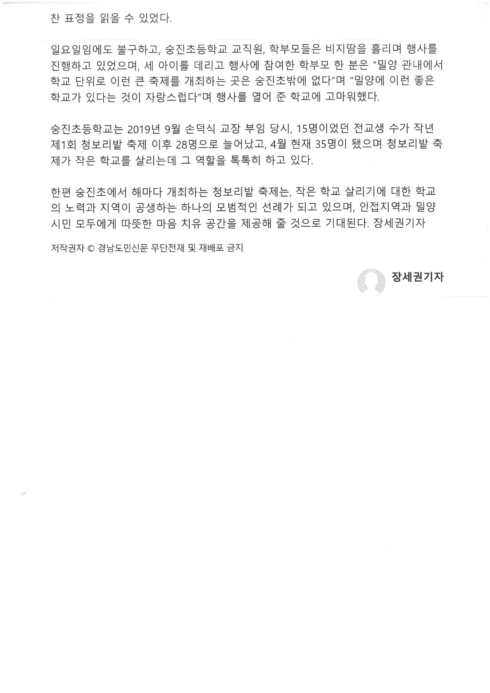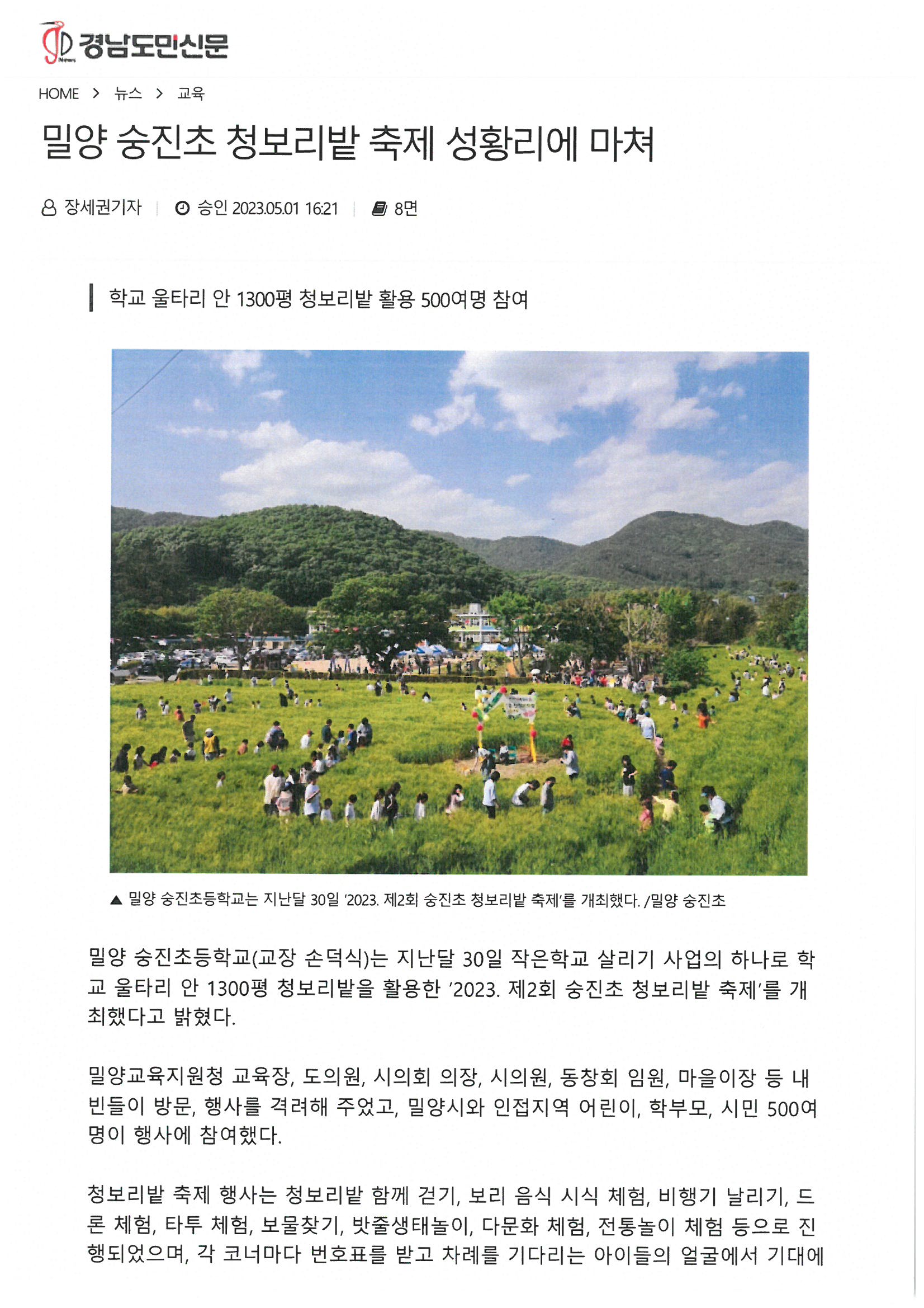 밀양 숭진초등학교, 청보리밭 축제 성황리에 마쳐(경남도민신문,2023.05.01.)언론보도 자료